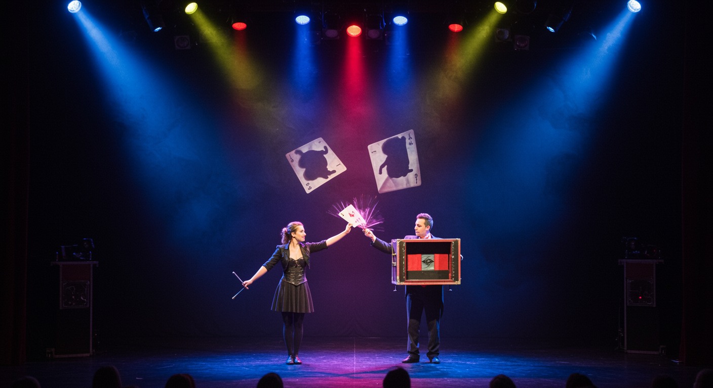 Spectacles de grande scène avec disparitions, lévitations et illusions visuelles spectaculaires. Pour les grands événements et festivals.