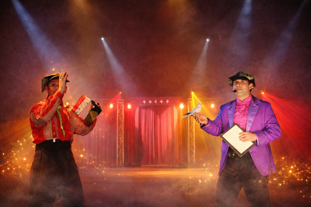 Une performance centrée autour d'un espace dédié, avec des numéros préparés et une dynamique de foule engageante.
